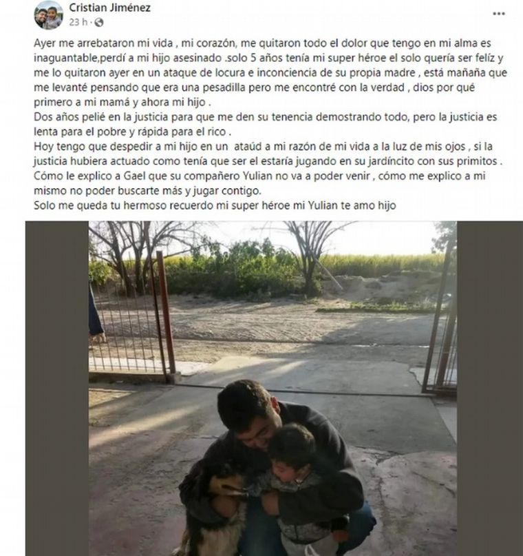 Cristian Jiménez, papá del nene de cinco años que fue asesinado por su mamá policía en Tucumán, redactó una emotiva carta de despedida luego de la trágica noticia.