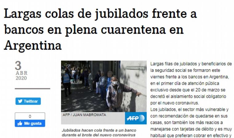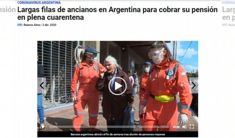 La agencia española EFE, de igual modo, apuntó hacia las largas filas de adultos mayores tras dos semanas en aislamiento social, preventivo y obligatorio en el país.
