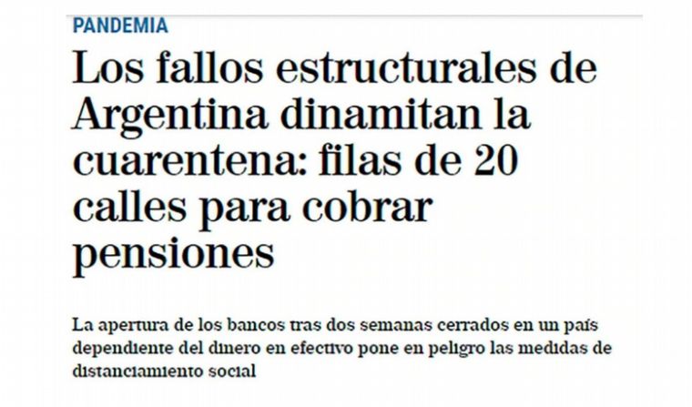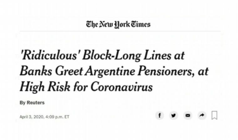 Gran repercusión en medios de comunicación del planeta por la situación que se registró este viernes en el país por las largas filas de adultos mayores, principal grupo de riesgo del Covid-19, al querer cobrar sus jubilaciones en las entidades bancarias.