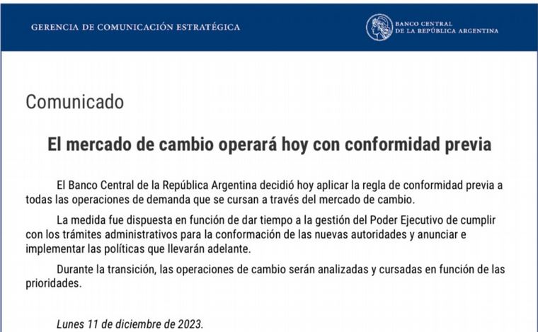 El Banco Central (BCRA) decidió hoy aplicar "la regla de conformidad previa a todas las operaciones de demanda que se cursan a través del mercado de cambio".