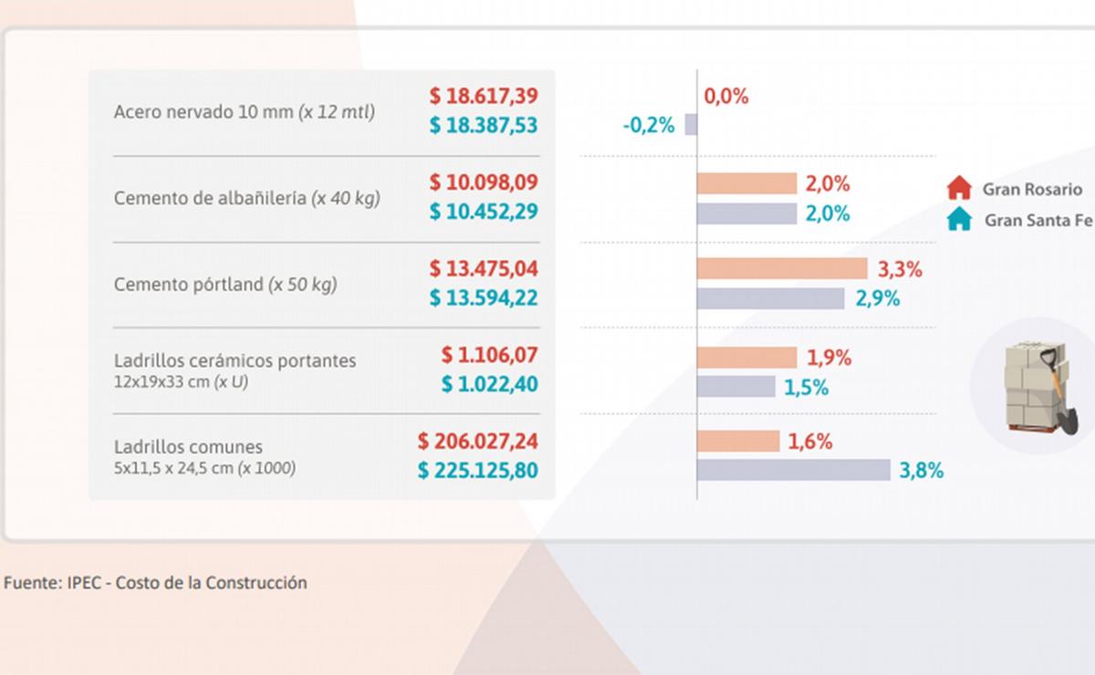 En el capítulo materiales, los aumentos más significativos en el Gran Rosario se registraron en impermeabilizaciones (4,2%), varios básicos (3,3%), revoques finos (2,9%), cementos (2,8%), yesos (2,6%) y pisos y revestimientos (2,5%). También se observaron subas en maderas, artefactos sanitarios, perfiles metálicos y cableado para instalaciones eléctricas.