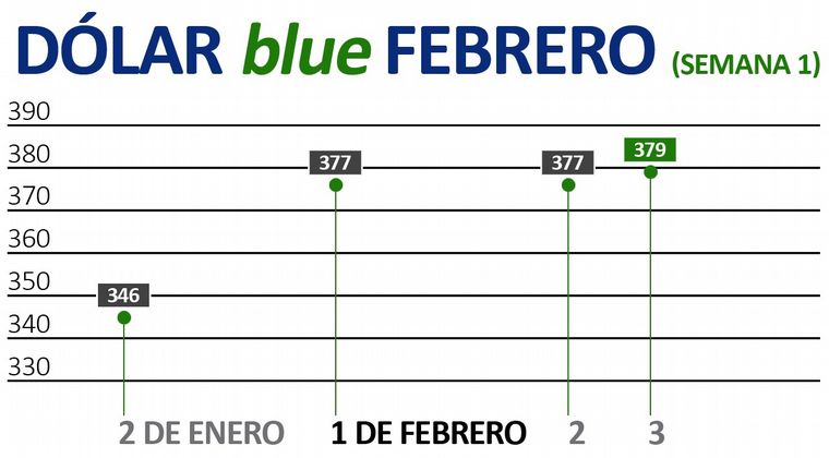 En enero, el blue avanzó $35 (+10,1%) y anotó su cuarta suba mensual consecutiva. En lo que va de 2023, acumula una suba de $33 después de cerrar el 2022 en $346. En 2022, el dólar informal avanzó $138 (+66,4%) después de cerrar el 2021 en los $208. Durante 2021, el dólar blue registró un alza de 25,3% ($42), la mitad respecto de la inflación del período (50,9%).