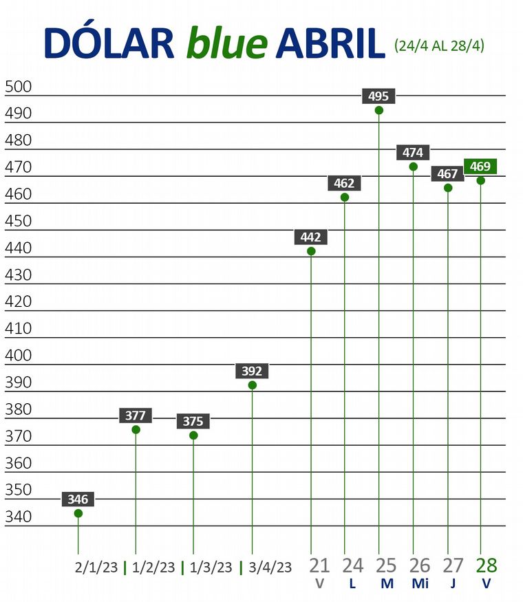 El dólar blue se tranquilizó y cerró abril en $469, con la mayor suba semanal de los últimos nueve meses, mientras los dólares financieros operaron dispares, tras la fuerte suba de tasas aplicada por el Banco Central.