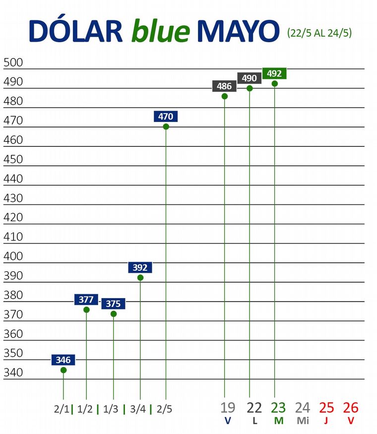 De esta forma la cotización del dólar informal parecía acercarse a su máximo nominal histórico ($497) y a la barrera psicológica de los $500.