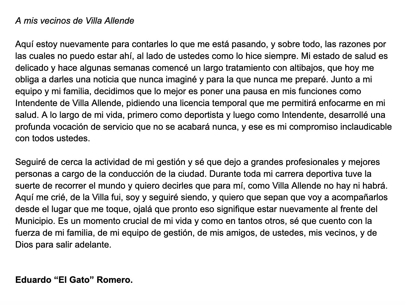 El intendente de Villa Allende, Eduardo "El Gato" Romero, anunció vía Twitter que pausará sus actividades como mandatario de la localidad para enfocarse en un tratamiento para mejorar su salud.