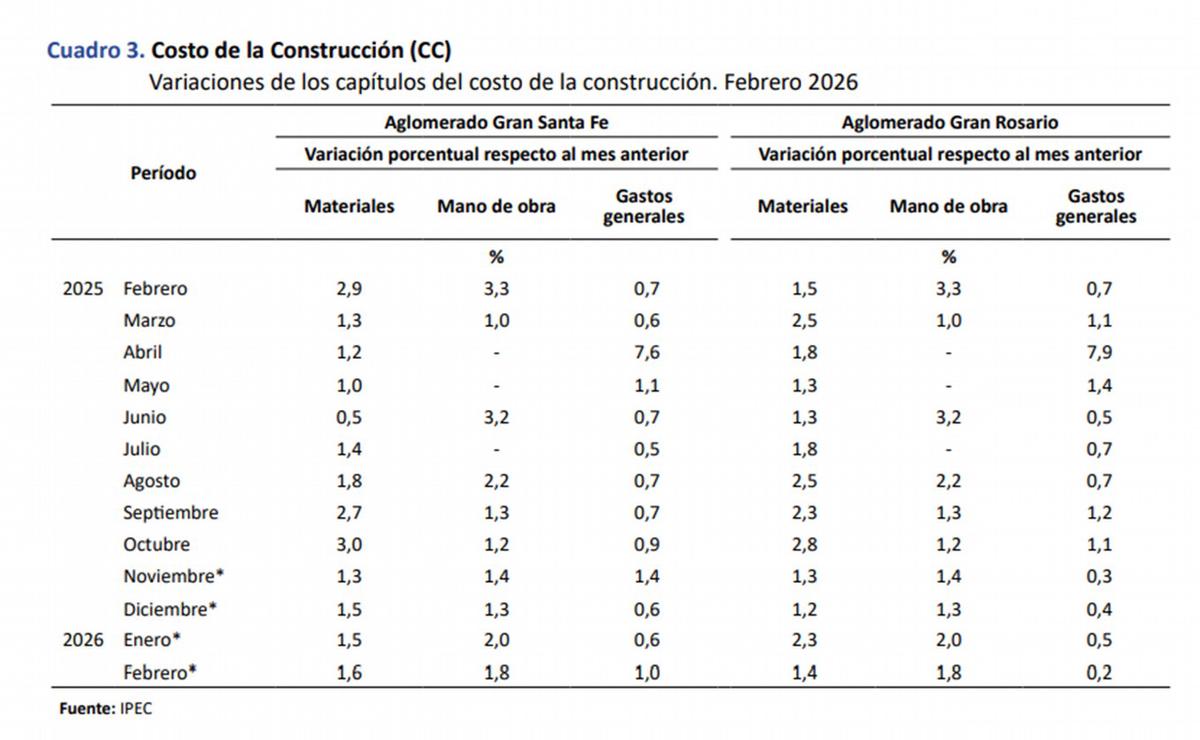Durante febrero, el componente que más incidió en la suba fue la mano de obra, que aumentó 1,8% tras la actualización salarial acordada por la Unión Obrera de la Construcción (Uocra). Los materiales, en tanto, registraron un incremento del 1,4%, mientras que los gastos generales apenas variaron un 0,2%.