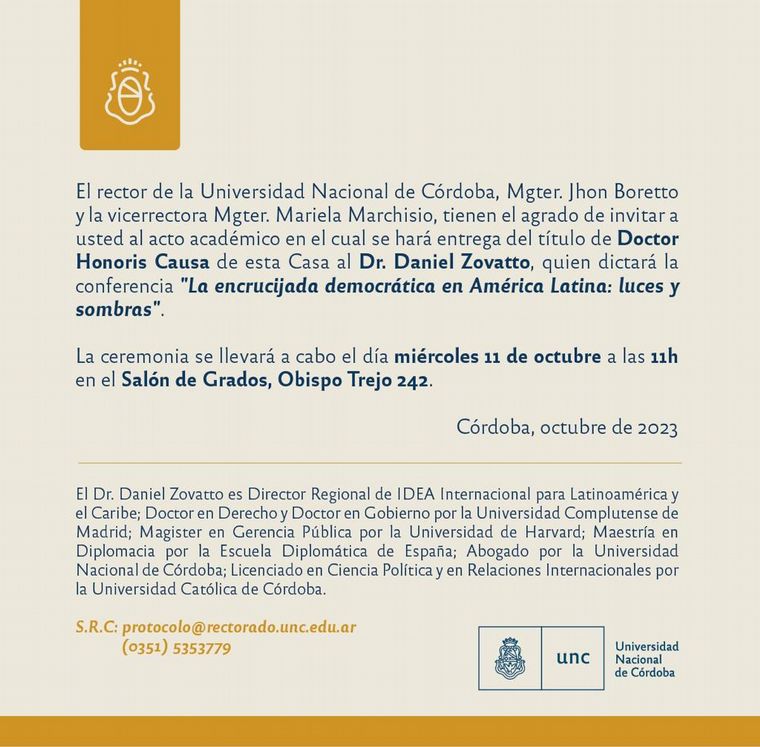 El rector de la Universidad Nacional de Córdoba (UNC), Jhon Boretto, y la vicerrectora, Mariela Marchisio, anunciaron este martes que el director regional de IDEA Internacional para Latinoamérica y el Caribe, Daniel Zovatto, recibirá el título de Honoris Causa.