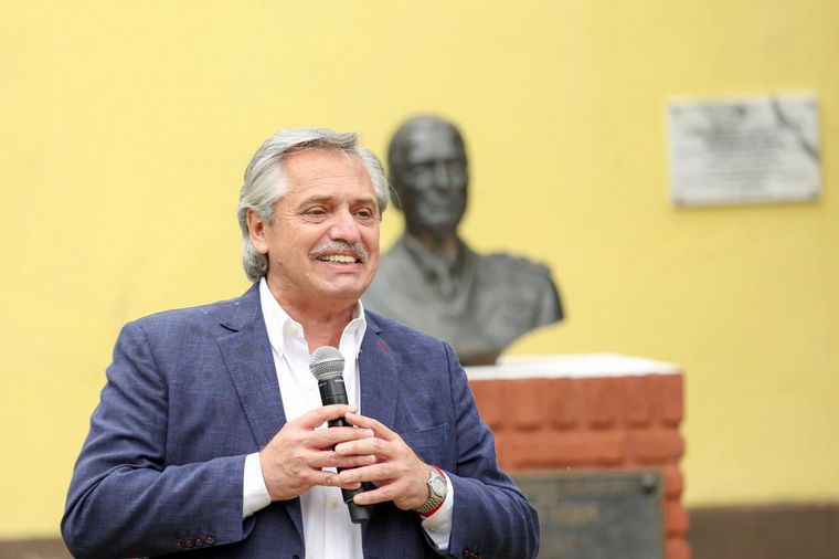 "En este histórico lugar en el que permaneció detenido nuestro teniente general Juan Domingo Presidente de la Nación Alberto Fernández y el gobernador de la provincia de Buenos Aires, Axel Kicillof", reza la placa descubierta por el jefe de Estado.