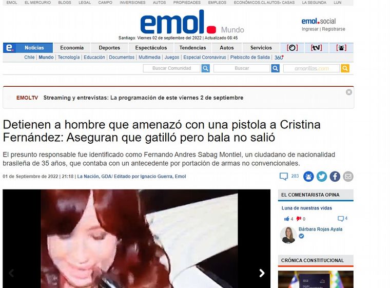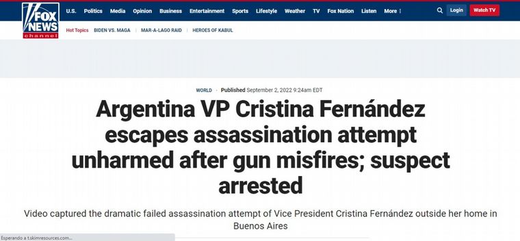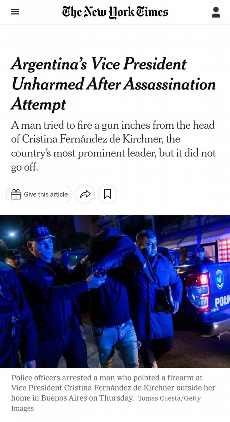 "Un intento de asesinato de la vicepresidenta argentina Cristina Fernández de Kirchner fracasó el jueves por la noche cuando un hombre le apuntó con una pistola a la cabeza e intentó apretar el gatillo, pero el arma no se disparó, según imágenes de video y un comunicado del presidente de Argentina", comienza diciendo el tabloide americano.