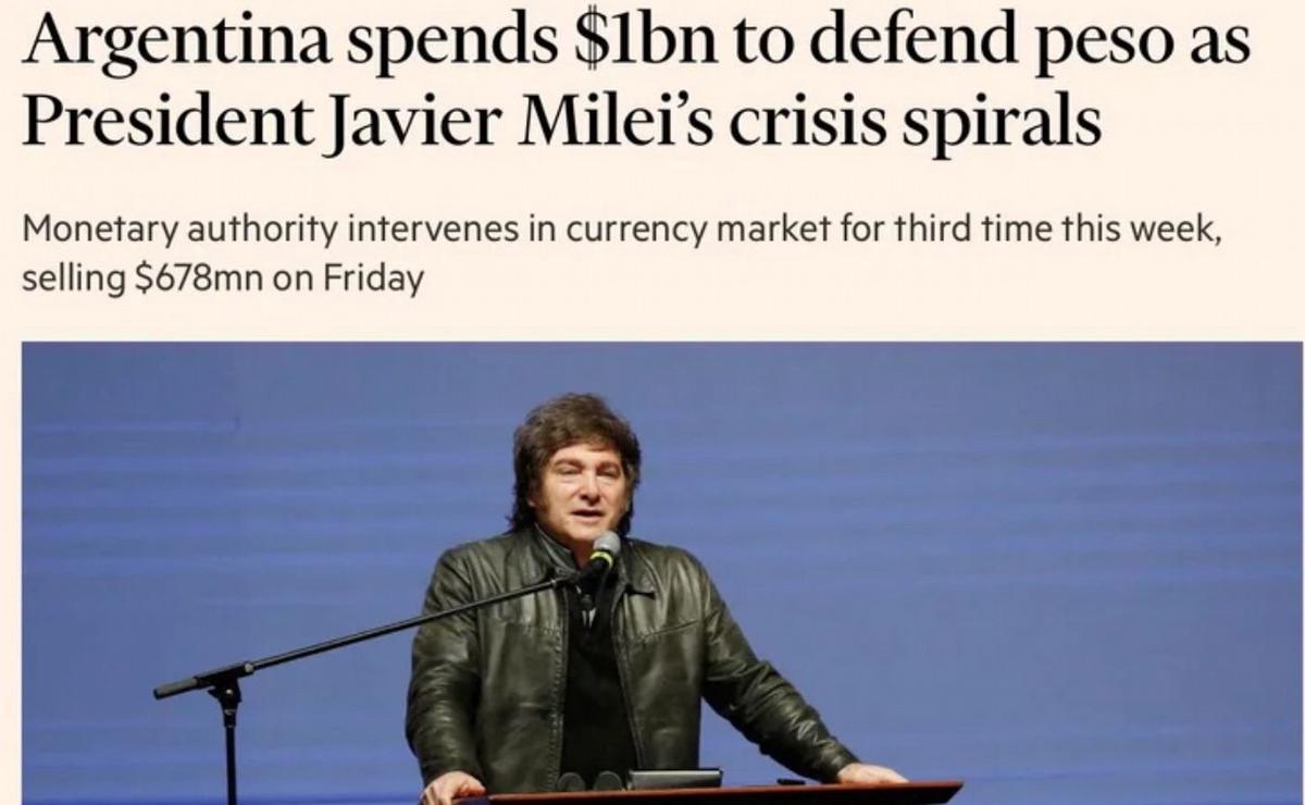 El diario económico británico Financial Times lanzó una dura crítica al plan económico del presidente Javier Milei, asegurando que "esta dinámica no es sostenible" y que "la crisis se agudiza" en Argentina. La publicación destaca que el Banco Central ha vendido más de u$s1.000 millones en tres días para intentar apuntalar al peso, en un contexto de incertidumbre política que ha "sacudido los mercados" y sembrado dudas sobre el futuro de las políticas de tipo de cambio.