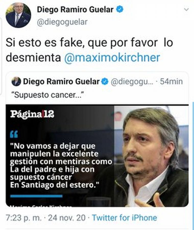 Guelar, a través de su cuenta de Twitter, replicó una publicación que contenía una falsa declaración de Kirchner al diario Página/12, en la que señalaba: “No vamos a dejar que manipulen la excelente gestión con mentiras como la del padre e hija con supuesto cáncer en Santiago del Estero”.