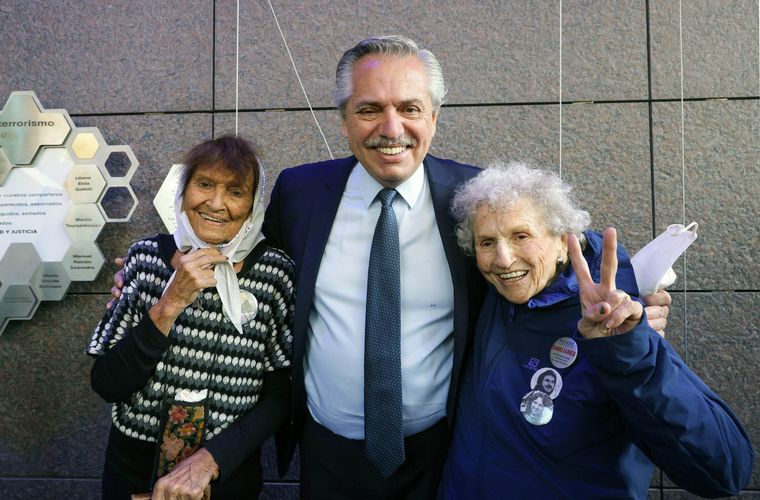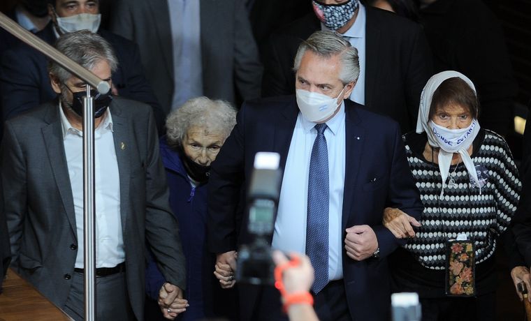 Junto al Presidente estuvieron también en el escenario Lita Boitano, la presidenta de Familiares de Desaparecidos y Detenidos por Razones Políticas, y Taty Almeida, referente de Madres de Plaza de Mayo Línea Fundadora.