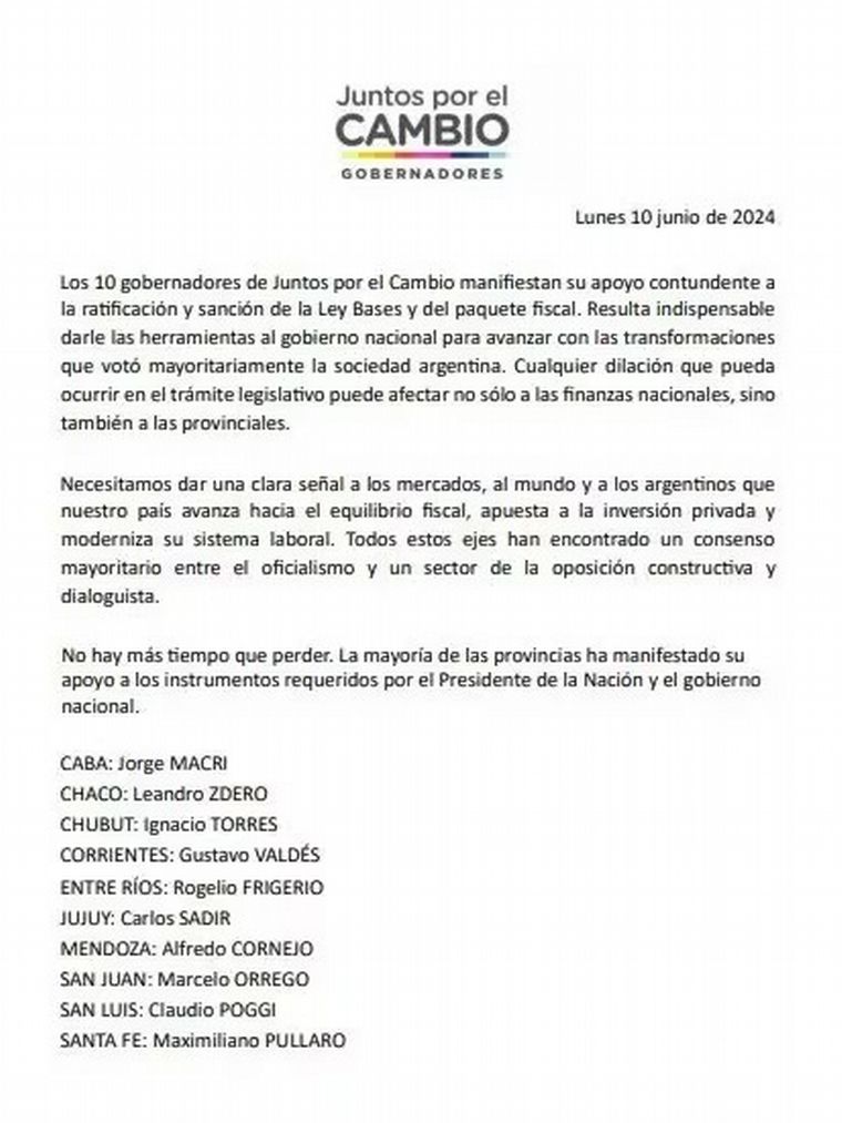 Los gobernadores de Juntos por el Cambio (JxC) respaldaron este lunes la Ley de Bases y el paquete fiscal, proyectos que serán debatidos el próximo miércoles en el Senado, mientras advirtieron que "cualquier dilación que pueda ocurrir puede afectar no solo a las finanzas nacionales, sino también a las provinciales".