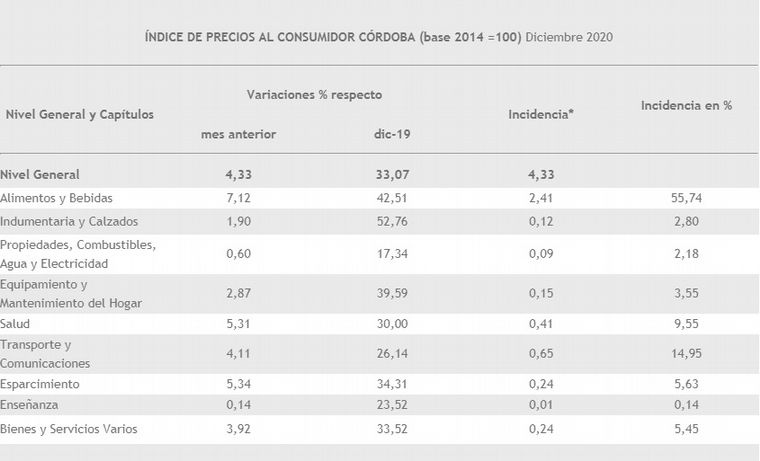 Según publicó este jueves la Dirección de Estadísticas y Censos de la Provincia de Córdoba, la suba de precios en diciembre se registró según el siguiente detalle: