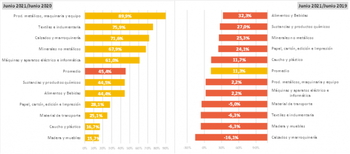 En tanto, frente a junio de 2020 la producción creció 44,5 por ciento, con las mayores tasas de variación anual en Productos metálicos, maquinaria y equipo (+89,9%) e Indumentaria y textil (+75,9%). Papel y cartón fue el que menos creció (+14,9%).