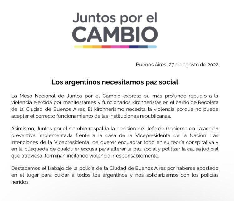 En un documento publicado en las redes sociales, el principal partido opositor manifestó su "repudio a la violencia ejercida por manifestantes y funcionarios kirchneristas”.