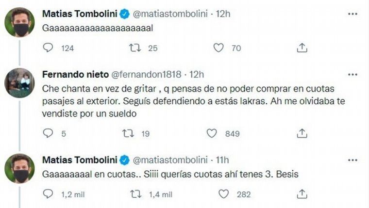Tombolini recogió el guante y respondió: "¿Vos de verdad le das entidad a esto? 1) Es tuiter. 2) River esta saliendo campeón. 3) Mi laburo lo hago todos los días y no tengo que justificar eso acá. 4) No seas amargo. Vamos 4 a 0 arriba. 5) ¿Querés hablar en serio? haceme una nota y tocamos todos los temas. Abrazo".
