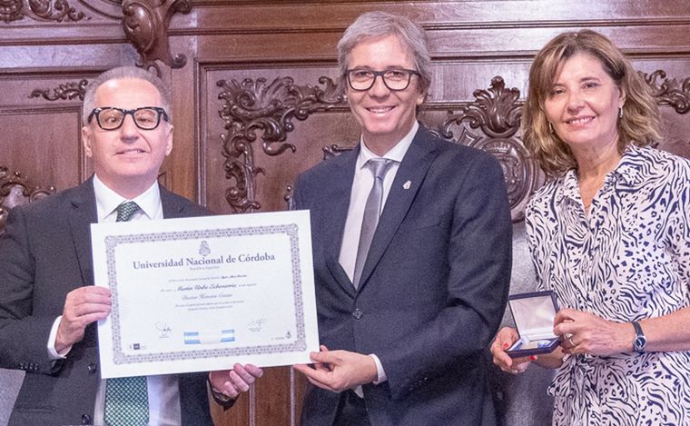 Martín Uribe Echevarría, al recibir el premio Honoris Causa por parte del rector de la UNC, John Boretto (Foto UNC).