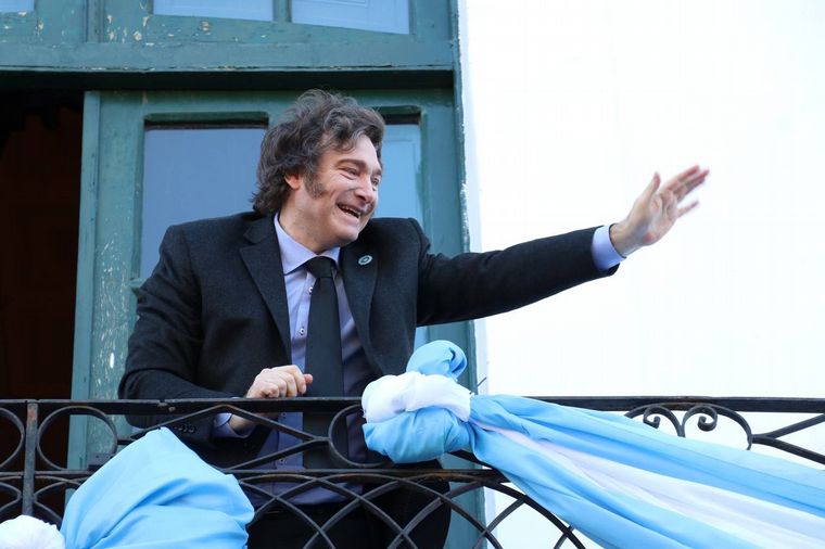 FOTO: Milei sorprendió al saludar desde un balcón del Cabildo.