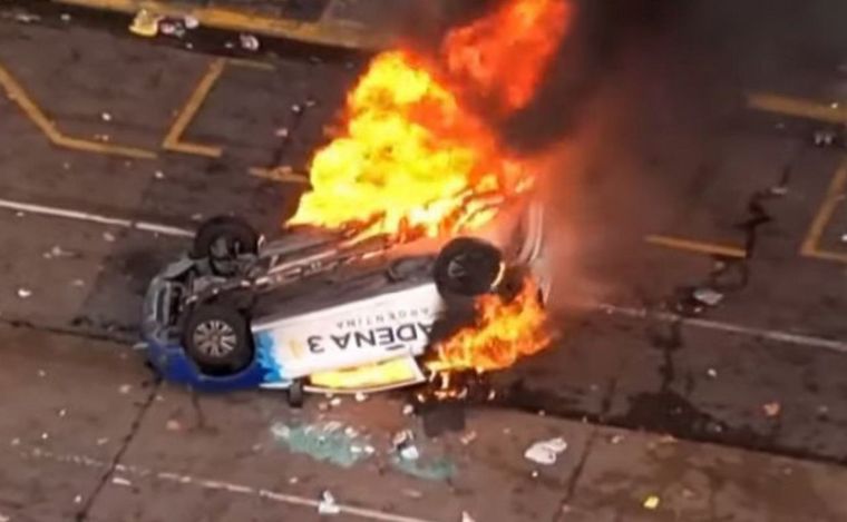 Repudiamos el grave ataque incendiario contra el móvil de @Cadena3Com en las cercanías al Congreso de la Nación, por parte de manifestantes. El automóvil incendiado pertenecía al cronista Orlando Morales, a quién los agresores golpearon cuando intentaba subirse al vehículo.