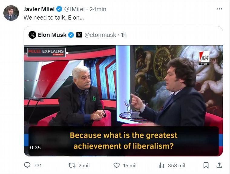 Milei, tras la publicación, respondió: "Necesitamos hablar, Elon".