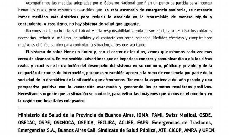 Acompañamos las medidas adoptadas por el Gobierno Nacional que fijan un punto de partida para intentar frenar los casos, pero estamos convencidos que, en este escenario de emergencia sanitaria, es necesario tomar medidas más drásticas para reducir la escalada en la transmisión de manera rápida y contundente. A este ritmo, no hay sistema de salud que aguante", subrayaron.