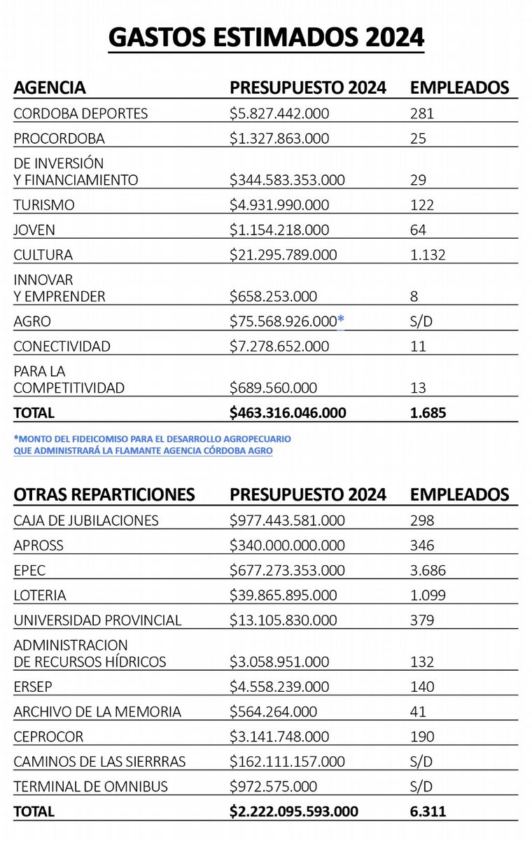 De acuerdo a lo presupuestado este año, en total tienen previsto gastos por alrededor de $463.000 millones. Si se tiene en cuenta la variación real de este año para prever el piso de gasto del 2024 la cifra se eleva a unos $695.000 millones. Para tener un punto de comparación: el presupuesto de la Municipalidad de Córdoba para el año entrante es de $557.000 millones.