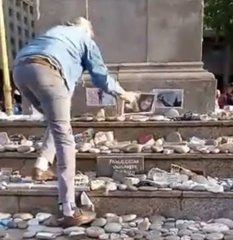 Algunos de los participantes de la marcha por el Día de la Lealtad se subieron al monumento a Manuel Belgrano. Pisaron las piedras del memorial y arrancaron fotografías de los fallecidos y carteles.