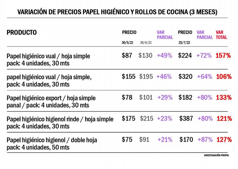 De acuerdo a datos proporcionados a Cadena3.com por algunos supermercados, entre junio y julio, Papelera del Plata (líder de mercado con su marca Higienol) aumentó entre 25% y 35% el precio del papel higiénico y los rollo de cocina. En lo que va del año el alza fue de entre el 65 y el 75%.