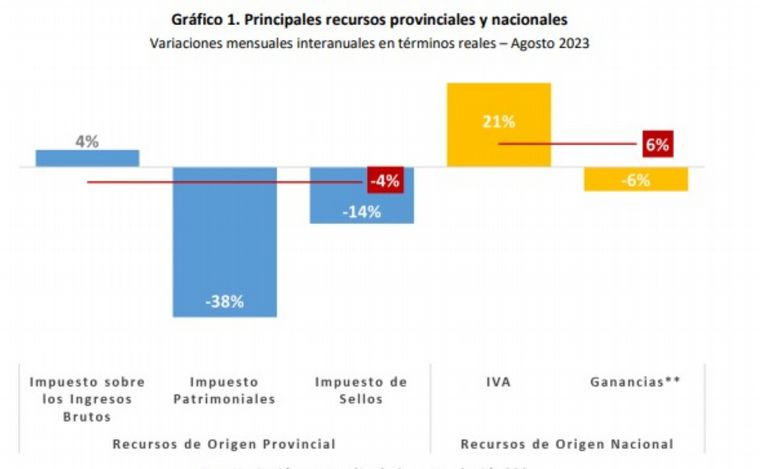 Sellos, que tiene una participación del 10% en la recaudación propia, muestra una variación negativa del 14% en términos reales respecto de agosto de 2022. Los impuestos patrimoniales, con una participación del 7% en la recaudación provincial, cayeron aproximadamente un 38% en términos reales respecto de agosto del 2022.