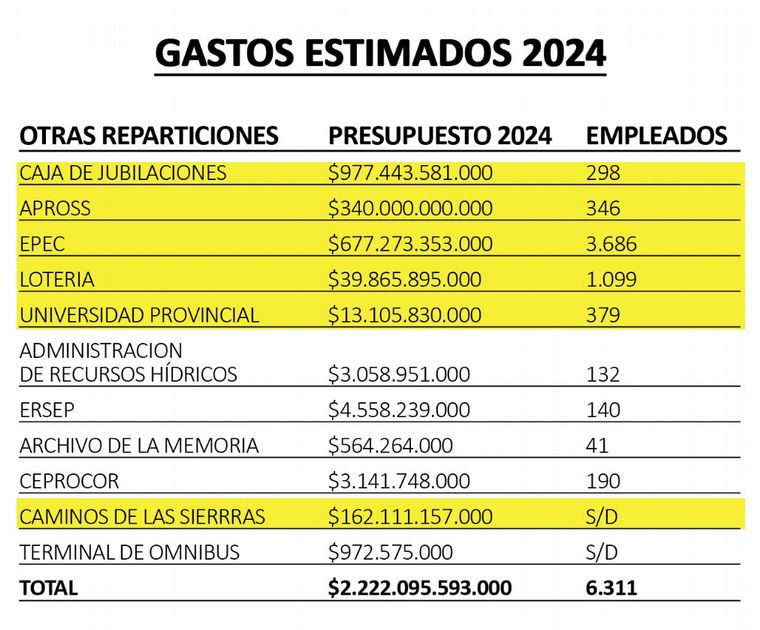 Sumando los $977.443.581.000 de la Caja de Jubilaciones, a los gastos previstos de Epec, Apross, Caminos de las Sierras, Lotería y la Universidad Provincial se tiene que para el año próximo se presupuestaron $2,2 billones para solo seis reparticiones estatales