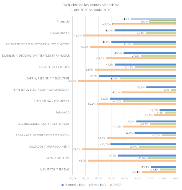 La Cámara Argentina de la Mediana Empresa (CAME) reportó en junio una caída en las ventas minoristas del 49,3% en el Área Metropolitana de Buenos Aires (AMBA) y del 20,3% en el resto del país.