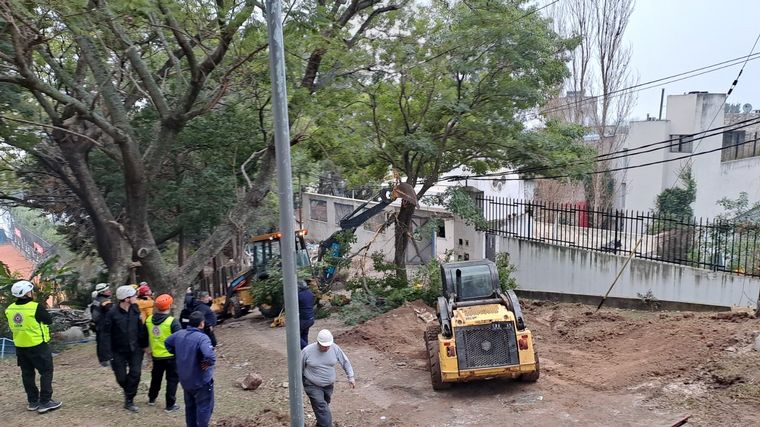 En una nueva etapa de trabajo, procedieron a derrumbar el tapial del frente, podar los arboles y quitar el tendido eléctrico para que la labor sea más sencilla. Igualmente, trabajan con especial cuidado por el inminente riesgo de derrumbe de la estructura que quedó en pie.