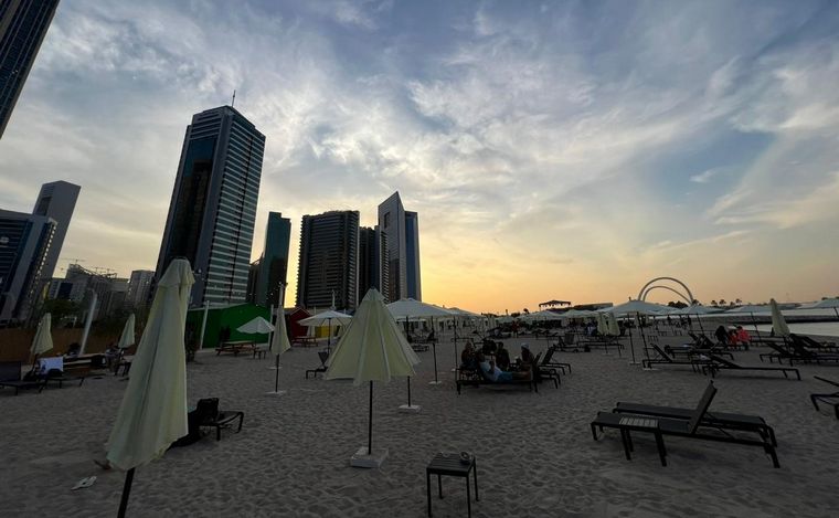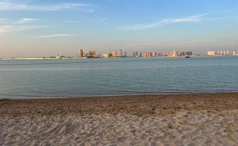 Con un magnífico atardecer que los edificios todavía permiten en Doha, Cadena 3 estuvo en la Playa B12, la playa privada open mind -mente abierta- de Doha, la capital del país.