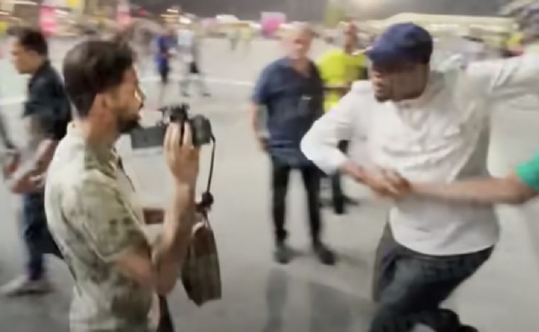 A Eto’o se lo distingue con una gorra azul mientras se tomaba selfies con fans antes de ser abordado por el youtuber, que le dice algo al exfutbolista que no se logra distinguir y desata su furia.