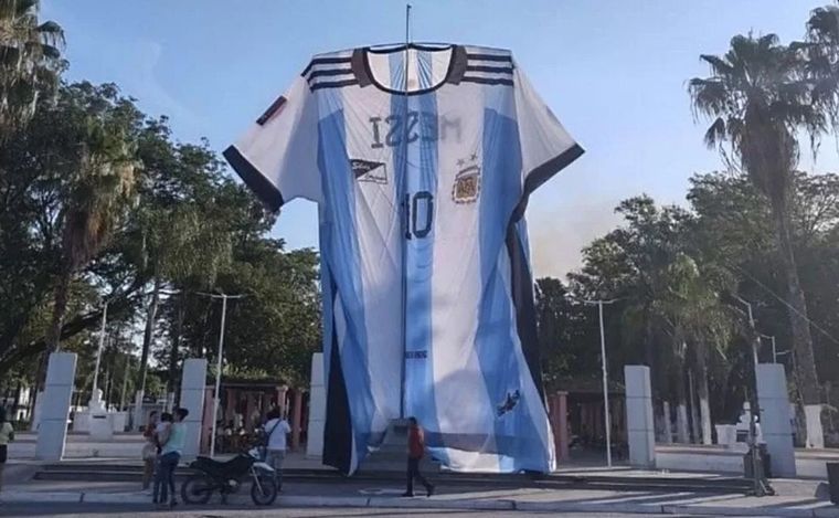 La casaca mide más de 15 metros de alto y tiene el número 10 en el pecho y el nombre "Messi" en la espalda. Fue colocada en el mástil de la plaza central de la localidad de Hipólito Yrigoyen.