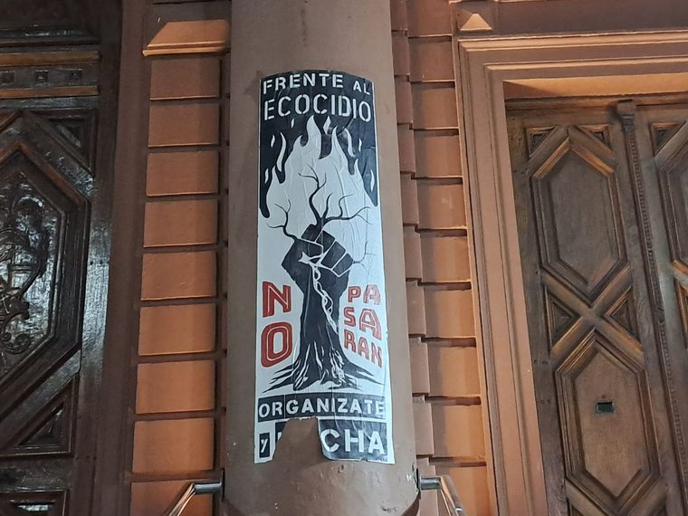 También en las columnas ubicadas en la entrada pegaron carteles en alusión al "ecocidio", calificación asignada a la problemática ambiental que vive la ciudad y el Delta del Paraná.
