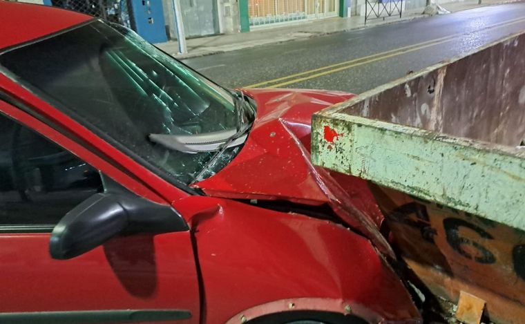 Un Chevrolet Corsa color rojo chocó contra un volquete de materiales de construcción en Mendoza al 5700, casi Roullión, al límite con barrio Belgrano.