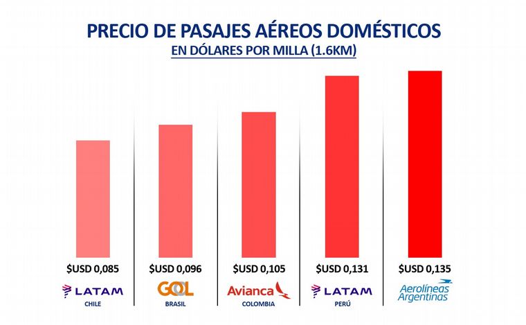 Argentina es el país con mayor precio por milla recorrida; con 0,272 dólares, casi duplica al costo de viajar vía Ecuador o Colombia (0,139 dólares por milla), y prácticamente triplica a Chile, Perú y Brasil (0,081, 0,087 y 0,094 dólares por milla, respectivamente).