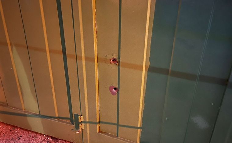 También se pudo observar el daño provocado por dos impactos de bala en el portón de la casa, en este caso en el garaje.