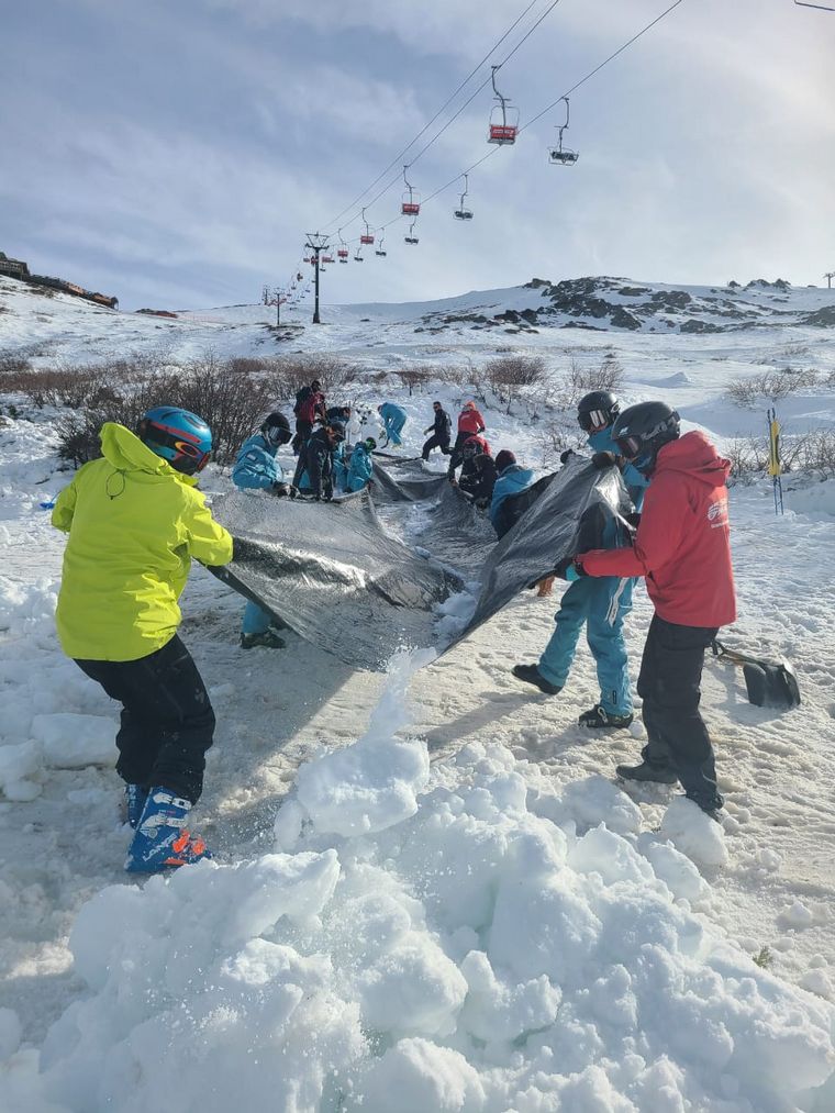 Es que aunque las condiciones climáticas no trajeron las mejores nevadas, se las ingenian para palear la poca nieve que hay y llevarla con un nylon sobre las pistas.