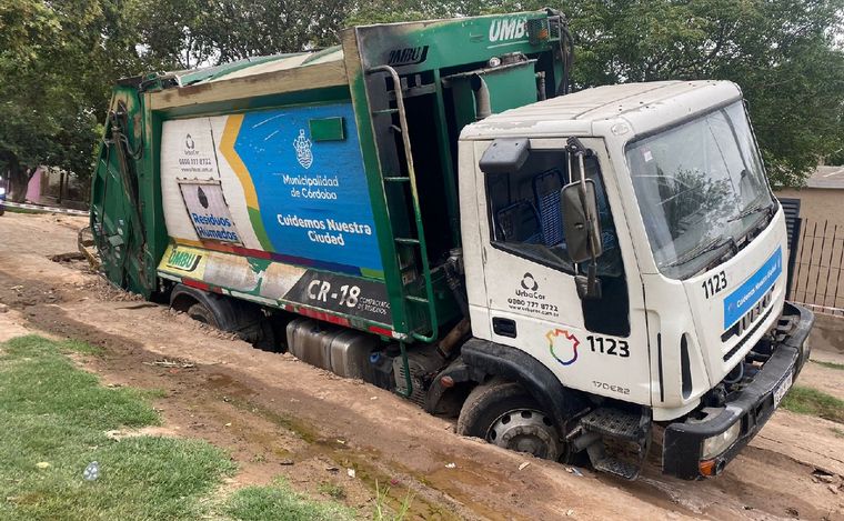 Audio. Un camión recolector de basura se hundió en un camino de tierra en Córdoba