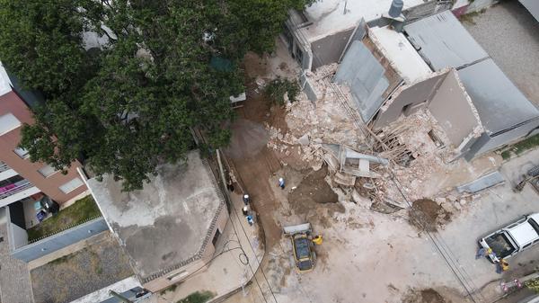 La empresa de demolición se hizo presente durante la mañana para limpiar la calle y asegurar la zona, que se encuentra restringida al tránsito en un radio de cuatro cuadras. Algunas viviendas, como la del frente y la del costado, debieron ser evacuadas por personal de Defensa Civil.