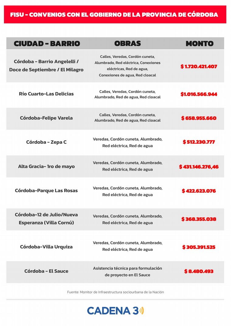 De acuerdo a los datos del Monitor de Obras de Integración Sociourbana, desde que se activó el FISU, marzo de 2020, se destinaron casi $22.300 millones a mejorar la infraestructura de barrios populares en toda la provincia de Córdoba. Los datos prácticamente coinciden con los brindados por la exsecretaria de de Integración Socio Urbana, Fernanda Miño, una dirigente muy ligada a Juan Grabois.