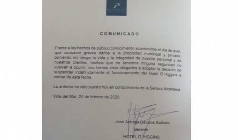 El Hotel O'Higgins decidió cerrar sus puertas de manera indefinida, luego que la primera noche del Festival Internacional de la Canción de Viña del Mar, sufriera daños en medio de una manifestación contra la realización de esa tradicional reunión de músicos y cantantes en la costa de Chile, convocada con la consigna "Sin justicia no hay festival".