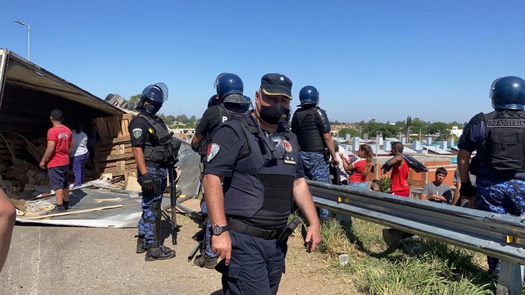 Unos 15 móviles policiales y personal de Infantería custodiaban el traslado de la mercadería a otro camión.