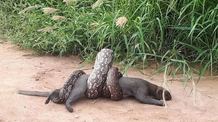 El episodio se registró en los últimos días y las imágenes y videos se viralizaron rápidamente. La serpiente asfixiaba al felino, que parecía sin escapatoria.