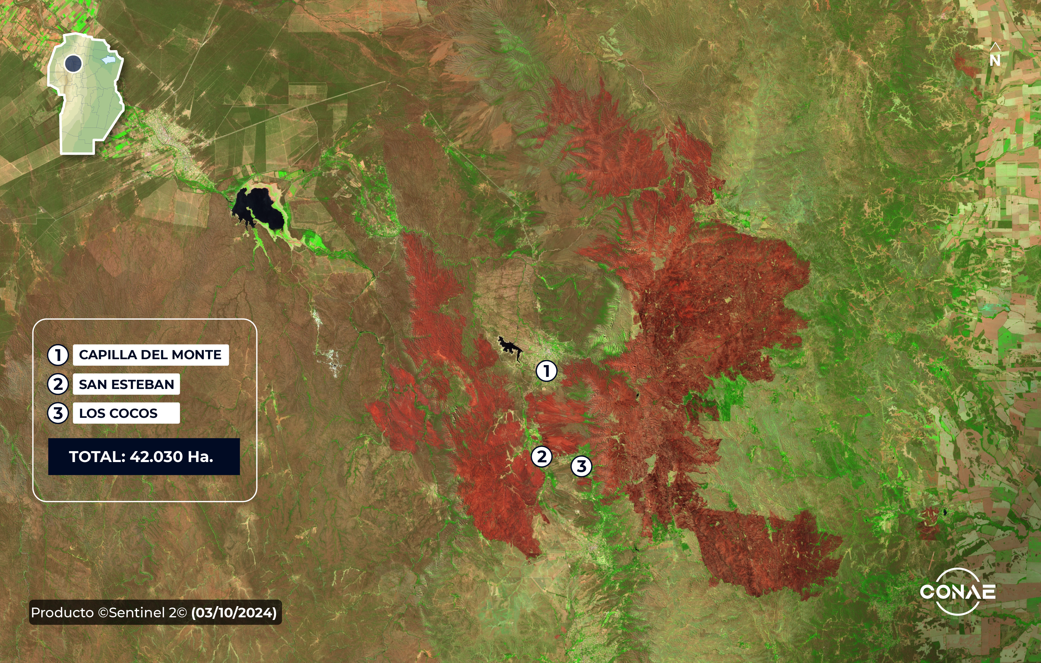Desde el inicio del año, la CONAE contabilizó un total de 76.896 hectáreas quemadas por grandes incendios en Córdoba. El recuento de hectáreas afectadas sólo en el incendio en Capilla del Monte, Chancaní y Villa Berna alcanza las 51.390 hectáreas mientras los incendios ocurridos anteriormente en la provincia afectaron 25.500 ha aprox.