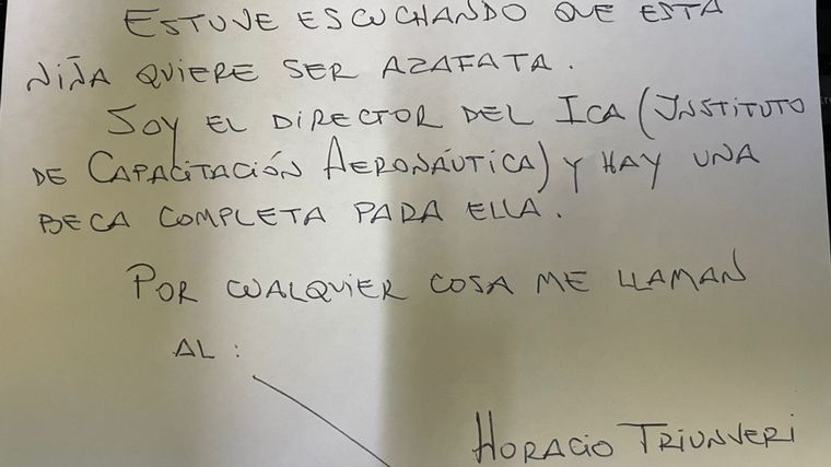 Este miércoles regresó a su casa, donde vive con su papá y sus hermanitos. En diálogo con Cadena 3 la joven contó que su sueño era ser azafata y su historia llegó a los oídos de Horacio Oscar Triunveri, director del Instituto de Capacitación Aeronáutico (ICA), quien se comunicó con la radio para avisar que le otorgan una beca completa para su formación.