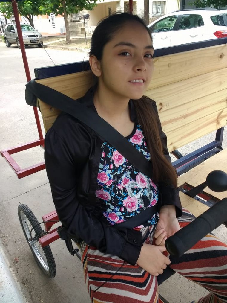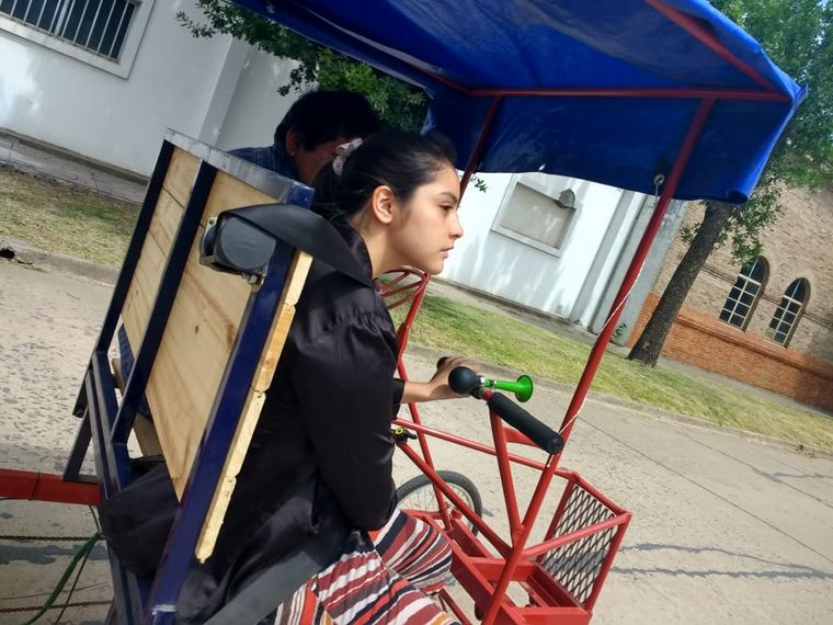La joven de 18 años sufrió una encefalitis en 2015. Por la pandemia tuvo que suspender sus terapias, pero su papá construyó un vehículo para que pueda seguir ejercitándose.